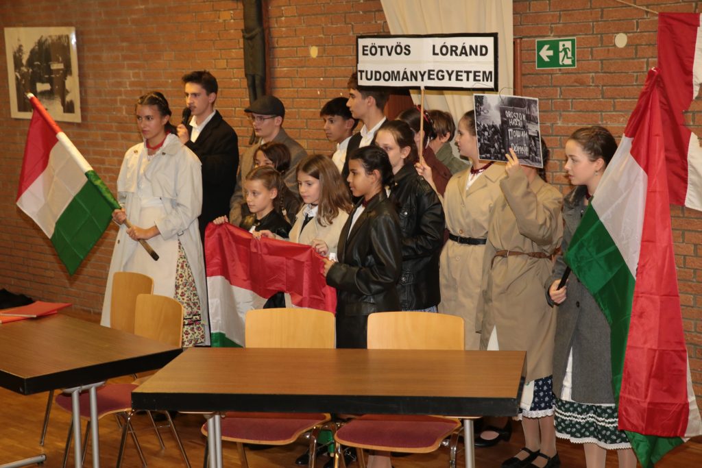 Az ünnepség keretén belül a frankfurti Cifra Néptáncegyüttes három korcsoportjának lányai egy szilágysági leánykörtáncot adtak elő, a Csodaország Klub fiataljai egy rövid színdarabban felelevenítették az ’56-os eseményeket, végezetül ismét a Cifra Néptáncegyüttes következett: a fiúk magyarpalatkai korcsost táncoltak. A műsorszámok között Klement Kornél vezetésével a közösség Kossuth nótákat énekelt, mely családiassá tette az eseményt.