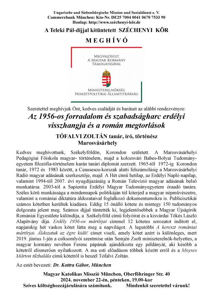 Kedves meghívottunk, Székelyföldön, Korondon született. A Marosvásárhelyi Pedagógiai Főiskola magyar- történelem, majd a kolozsvári Babes-Bolyai Tudomány-egyetem filozófia-történelem karán tanári diplomát szerzett. 1965-től 1972-ig Korondon tanár, 1972 és 1983 között, a Ceausescu-korszak alatti felszámolásig a Marosvásárhelyi Rádió magyar adásának szerkesztője, majd A Hét című hetilap, az Erdélyi Napló napilap, valamint 1994-től 2007. évi nyugdíjazásáig a Román Televízió magyar adásának belső munkatársa. 2003-tól a Sapientia Erdélyi Magyar Tudományegyetem óraadó tanára. Széles körű munkássága a mindennapok politikáján túl kiterjed a magyar népművészetre, valamint a romániai diktatúra áldozataival foglalkozó dokumentumokra is. Publicisztikái számos kötetben kerültek kiadásra. Eddig 15 önálló kötete és mintegy 150 tudományos dolgozata jelent meg. Számos díjjal tüntették ki, legjelentősebbek a Magyar Újságírók Romániai Egyesülete különdíja, a Székelyföld című folyóirat és a kisvárdai Tőkés László Alapítvány díja. Erdély 1956-os mártírjai címmel 12 kötetes sorozatot indított el, napjainkig hét vaskos kötet látta meg a napvilágot. A legutóbbi A kereszt romániai mártírjai. Áldozatuk az égre kiált! címet viseli, amely kötet azért is különleges, mert 2019. június 1-jén a csíksomlyói szentmise után Semjén Zsolt miniszterelnök-helyettes, a magyar kormány nevében Ferenc pápának ajándékozta egy példányát, aki késöbb a kötetről elismerően nyilatkozott. A ma esti előadáson többek között erről és a Moyses Márton tűzhalála című kötetről is beszél Tófalvi Zoltán.
