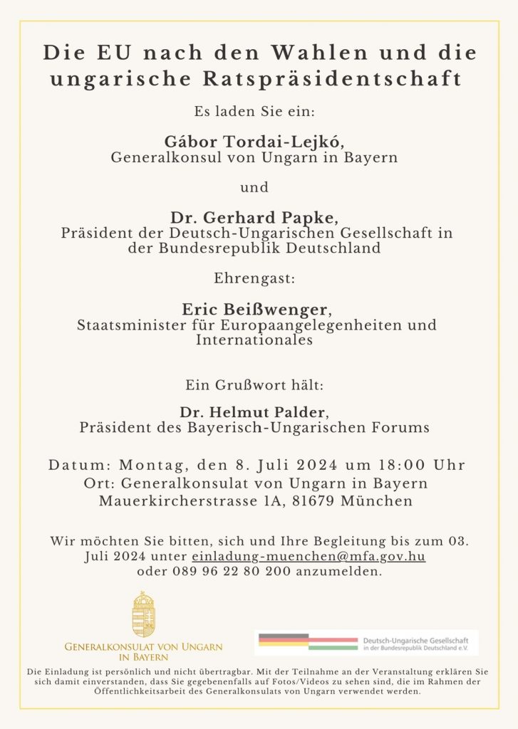Über diese hochaktuellen Fragen werden wir auch auf der gemeinsamen Veranstaltung von Generalkonsulat Ungarns und Deutsch-Ungarischer Gesellschaft in München diskutieren. Generalkonsul Gábor Tordai-Lejkó und ich würden uns sehr freuen, Sie am 8. Juli begrüßen zu können!
