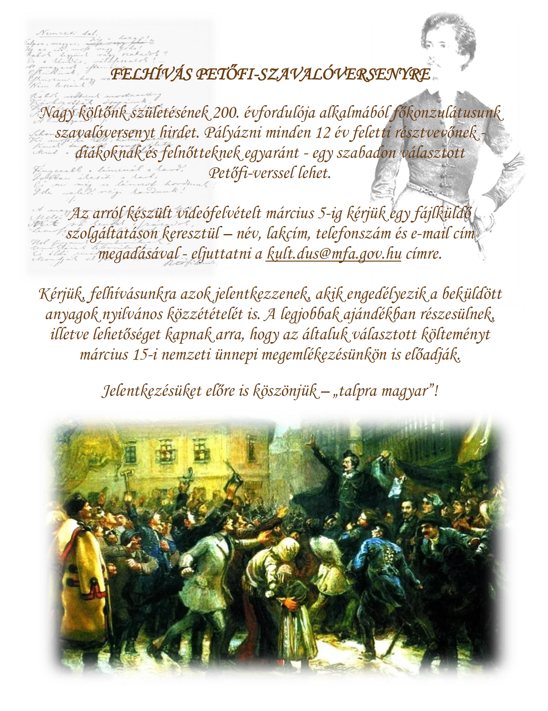 Kedves Mindnyájan! Továbbítom a Düsseldorfi Magyar Főkonzulátus felhívását a Petőfi szavalóversenyre, vagyis egy Petőfi-vers szavalásáról készült videó-felvételének beküldéséről március 5-ig. Ezt egy nagyon jó ötletnek és kezdeményezésnek tartjuk! Üdvözlettel – Klement Kornél (Kori9