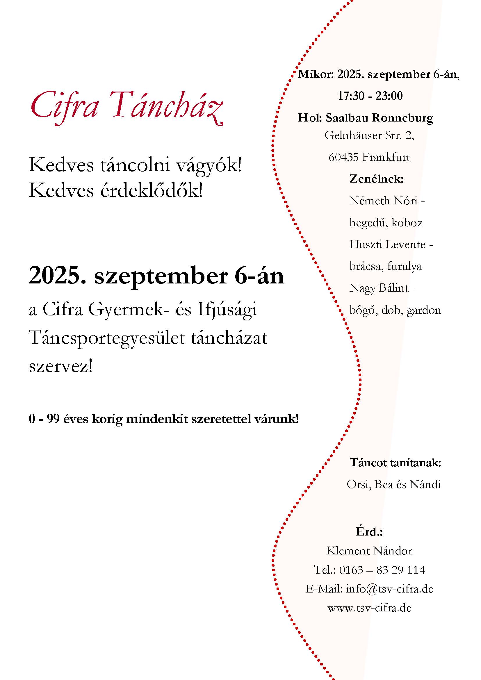 Cifra Táncház Kedves táncolni vágyók!Kedves érdeklődők! a Cifra Gyermek- és Ifjúsági Táncsportegyesület táncházat szervez! 0 – 99 éves korig mindenkit szeretettel várunk! Mikor: 2025. szeptember 6-án, 17:30 – 23:00 Hol: Saalbau RonneburgGelnhäuser Str. 2, 60435 FrankfurtU5 Ronneburgstraßehttps://maps.app.goo.gl/RHuVY8WNeojZeTTp6 Zenélnek: Németh Nóri – hegedű, kobozHuszti Levente -brácsa, furulyaNagy […]