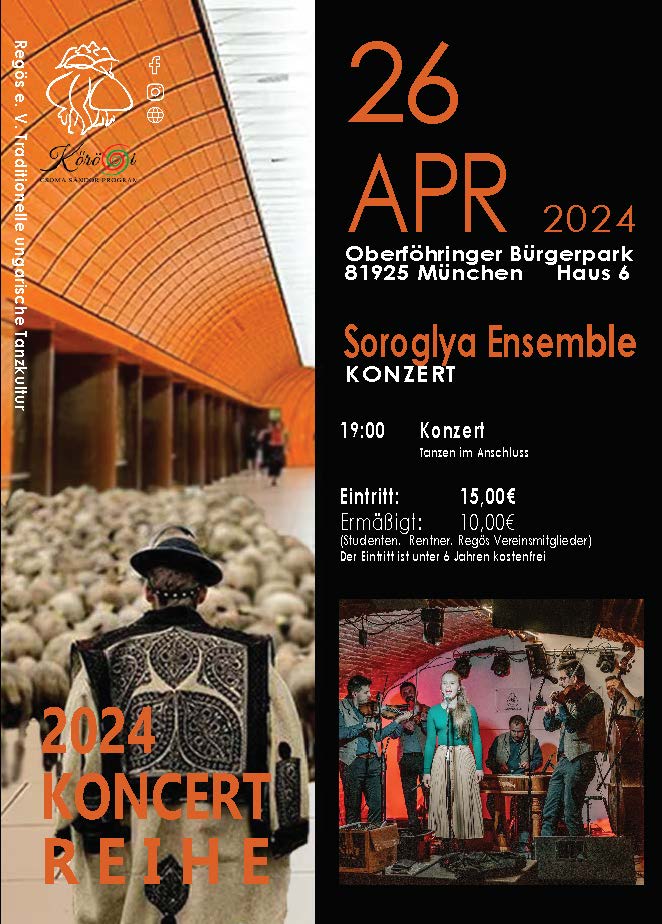 Április 26-án (pénteken) 19 órától folytatódik a Regös Egyesület koncertsorozata, melynek második részeként a nagyváradi Soroglya zenekar ad koncertet Münchenben.