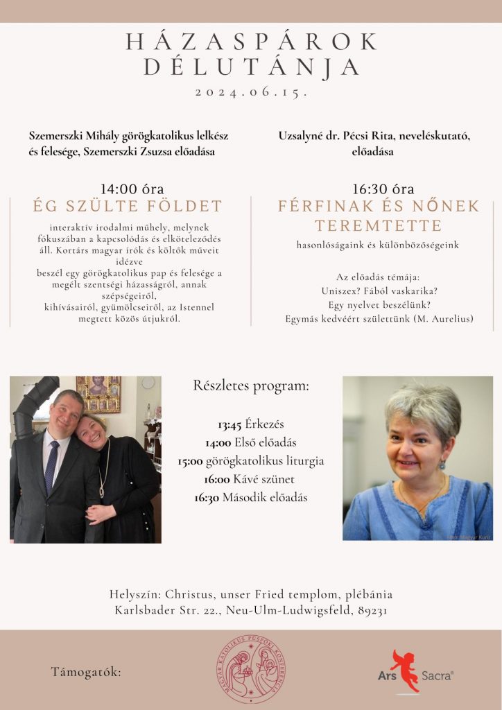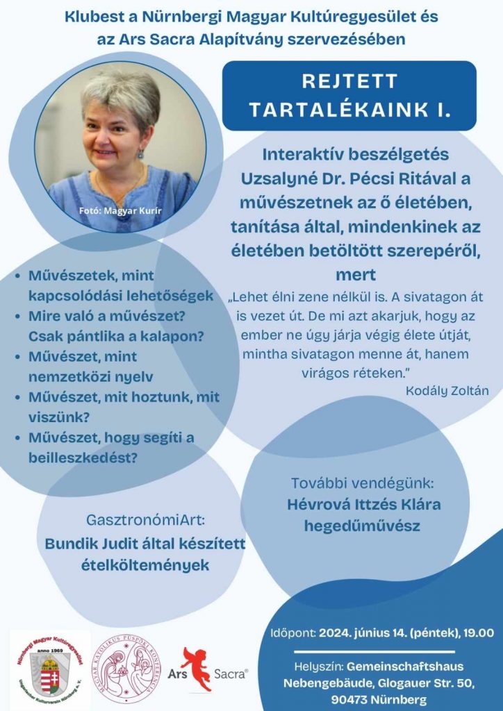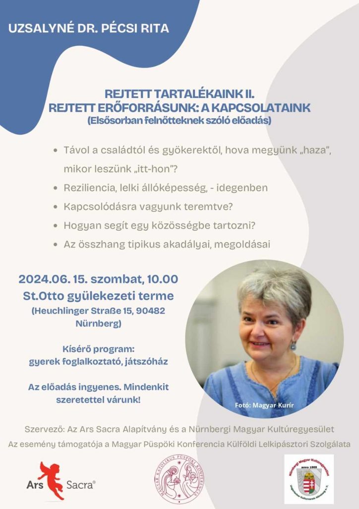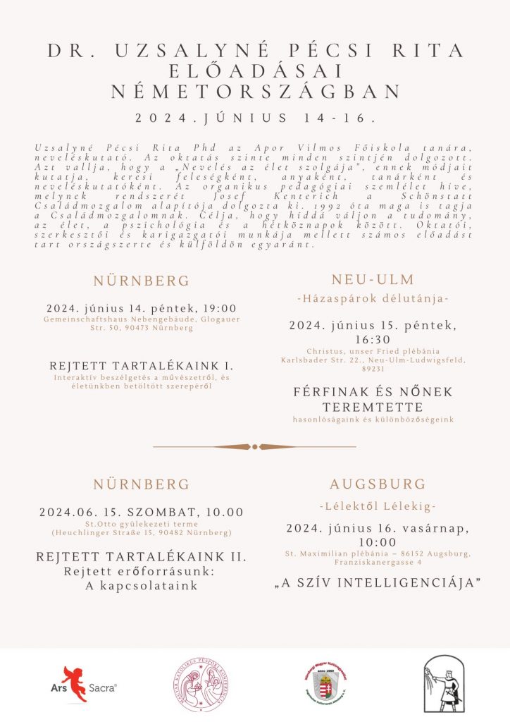 Szeretettel tájékoztatunk benneteket Uzsalyné dr. Pécsi Rita neveléskutató bajorországi előadássorozatáról, amely a Magyar Katolikus Püspöki Konferencia (MKPK) és az Ars Sacra támogatásával valósul meg az augsburgi Szent László Magyar Katolikus Misszió és a Nürnbergi Magyar Kultúregyesület szervezésében. Az előadásokra épített programok három helyszínen – Augsburgban, Neu-Ulmban és Nürnbergben – négy különböző témát érintenek. Dr. Pécsi Rita az idei – a Nemzetpolitikai Államtitkárság által – immár hetedik alkalommal megrendezett Hétvégi Magyar Iskolák Találkozójának vendégelőadója is volt. Szeretettel hívunk, és várunk benneteket bármelyik helyszínre!
